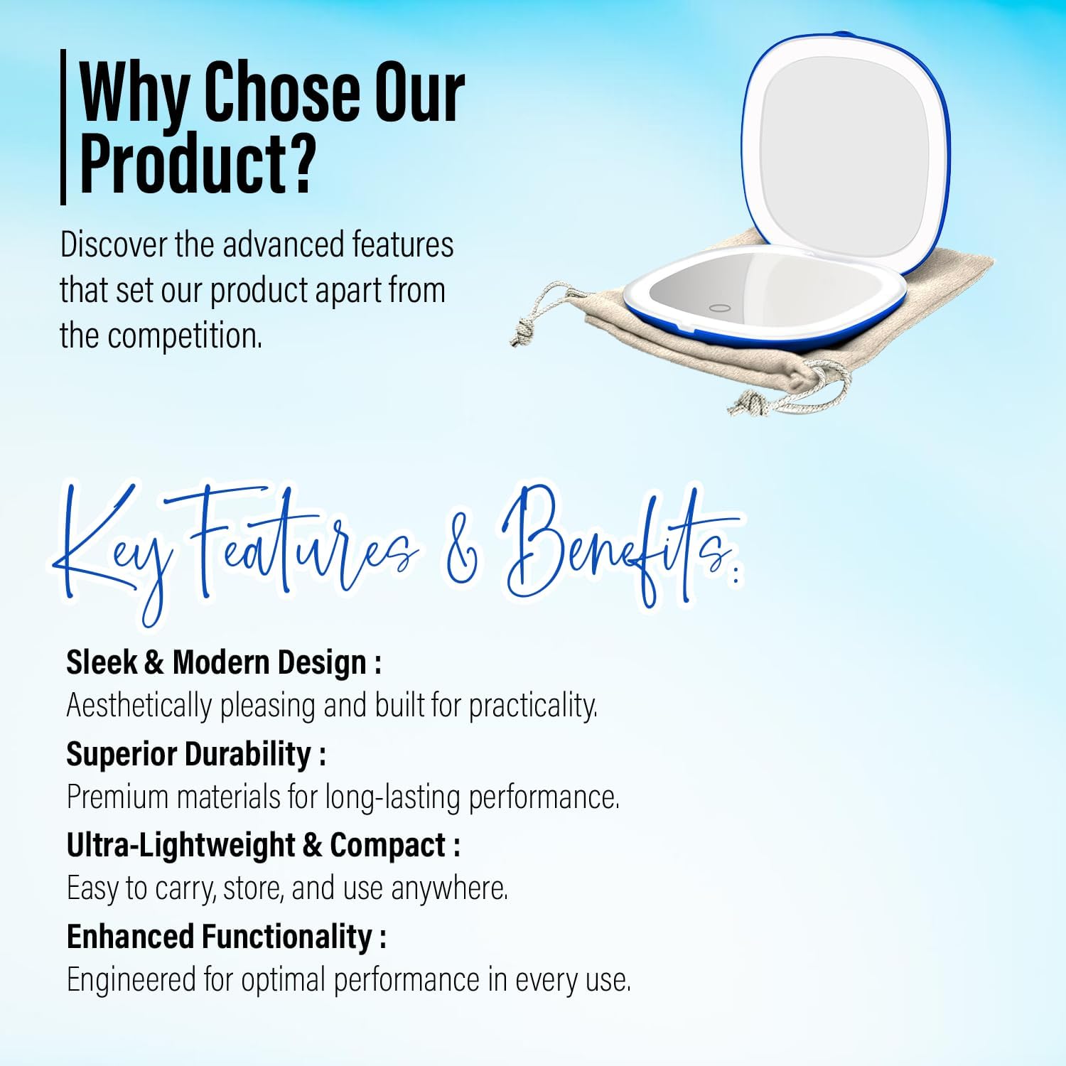 - [Ultra-Portable & Stylish] – Slim, lightweight, and just 4 inches, this pocket mirror easily fits into handbags, making it an ideal travel mirror with light for beauty touch-ups anytime, anywhere..
