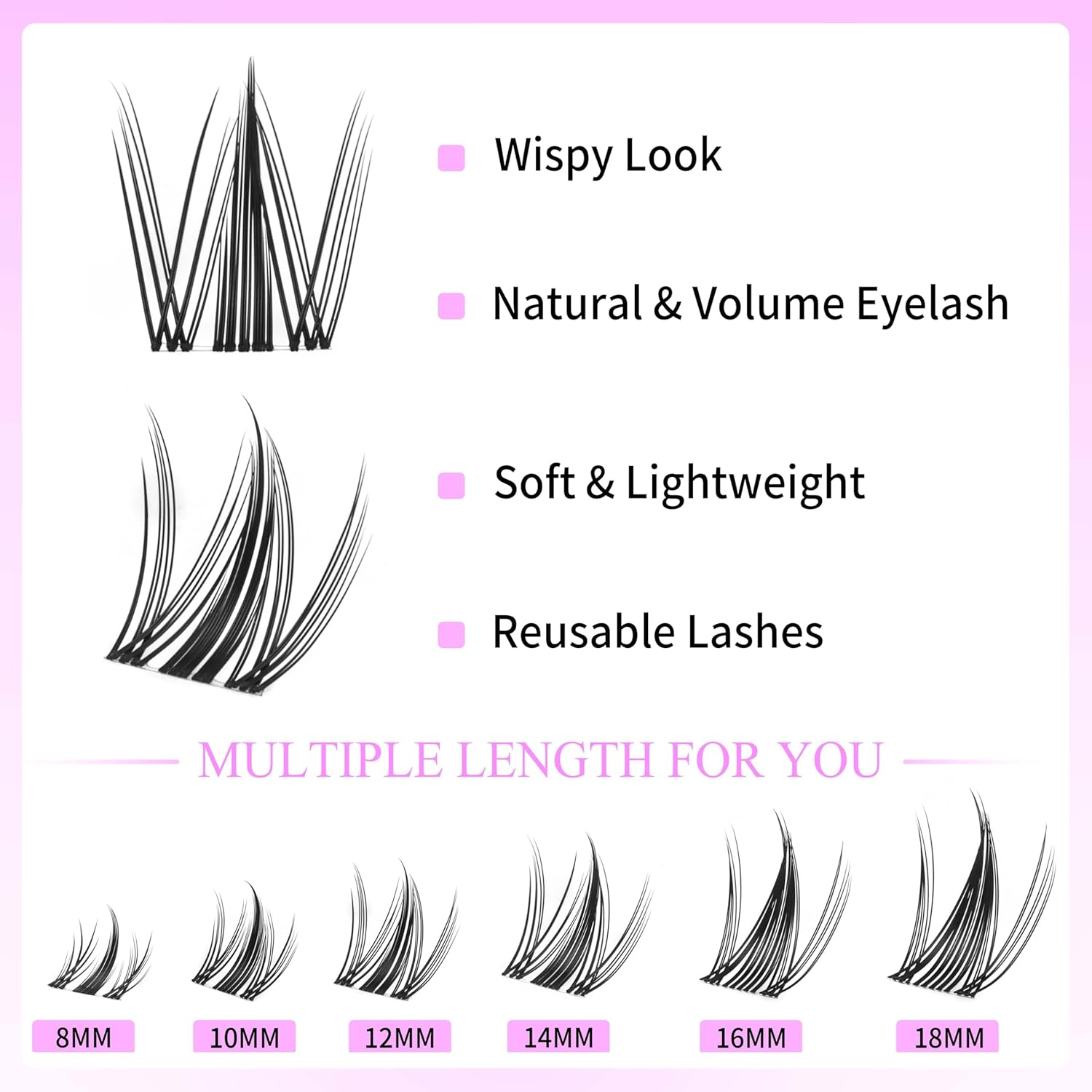 - Newbie's Five-Second Lashes : Eyelash clusters with wider bands, only 4-6 clusters per eye, ensure that lash newbies can simply and quickly complete a perfect lash extension(Only eyelashes, does not include glue and glue remover, can be purchased separately)