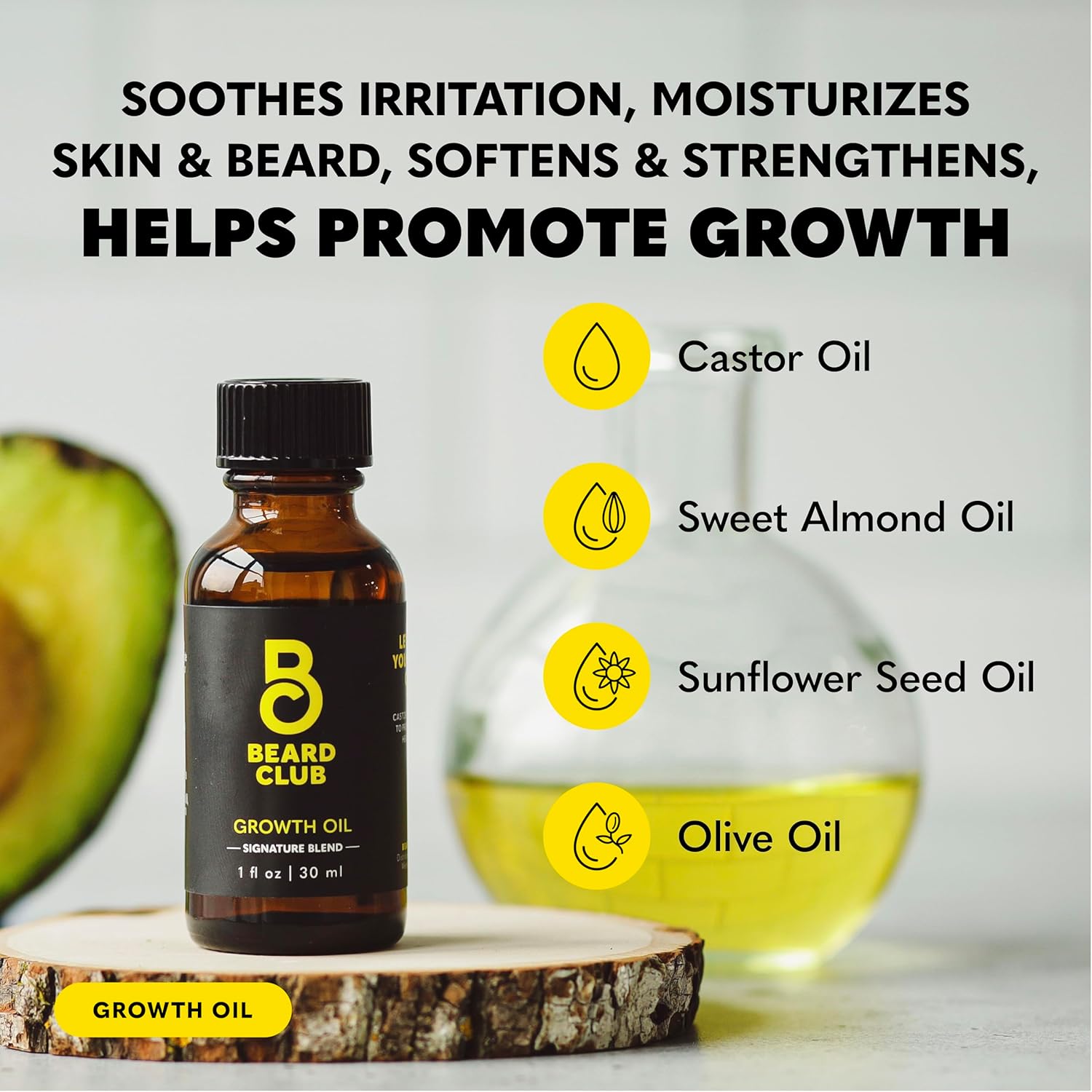 - Beard Growth Oil - A blend of natural oils, Castor, Cedar and Avocado helps to strengthen roots, soothe itch while softening skin and helping to support healthy hair growth