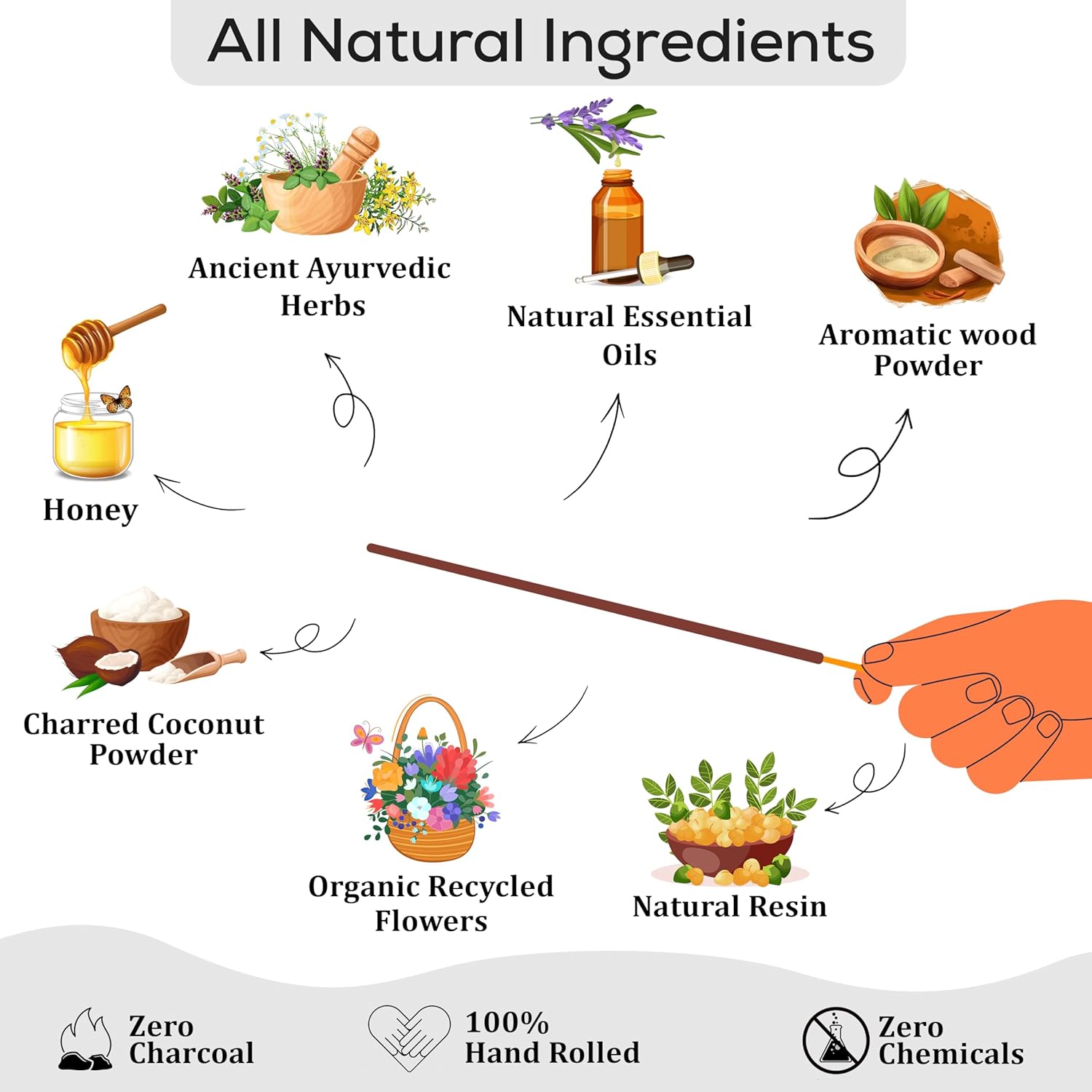 - 100% NATURAL Natural incense Sticks completely handmade MADE FROM SCRATCH by blending natural resins, Herbs, Spices with aromatic wood powders, charred coconut powder fragrant oils and honey.No Dipping in Toxic Chemicals.