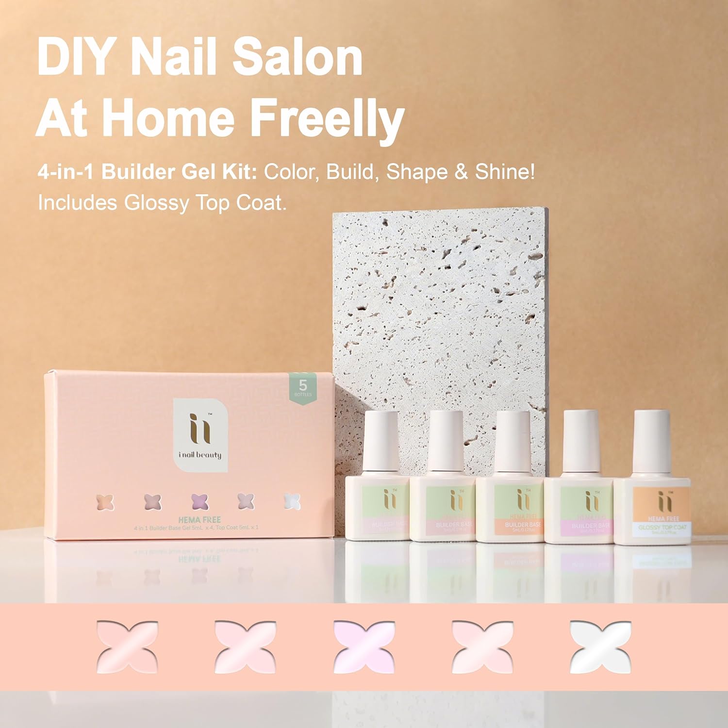 - WHAT YOU GET: 4 bottles of 4 in 1 builder base gel polish with 1 top coat, Can be used as color gel, base coat, builder gel and nail strengthening paint: In cold weather, the nail base coat gel will become thicker, which is normal. Before applying, you can put the bottle in warm water for a while to get a better consistency.