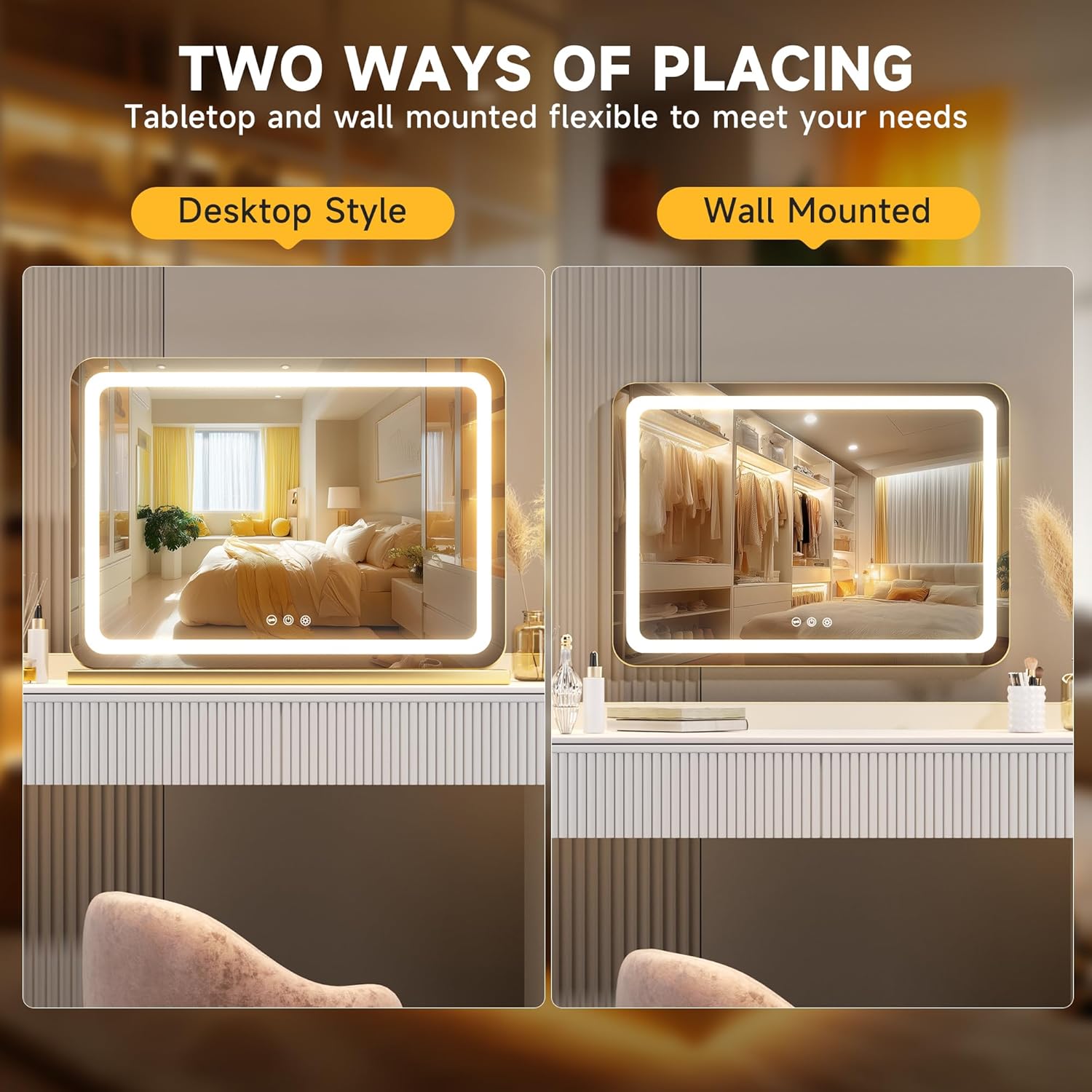 - 👍【Smart Touch Control & Memory Function】This makeup mirror with lights has 3 smart touch buttons, turn on/off the light by touching the sensor switch, Press left button to change the color modes, long press right button to adjust the led brightness. This lighted makeup mirror is specially designed memory functionfunction keep your lights setting like your last use.