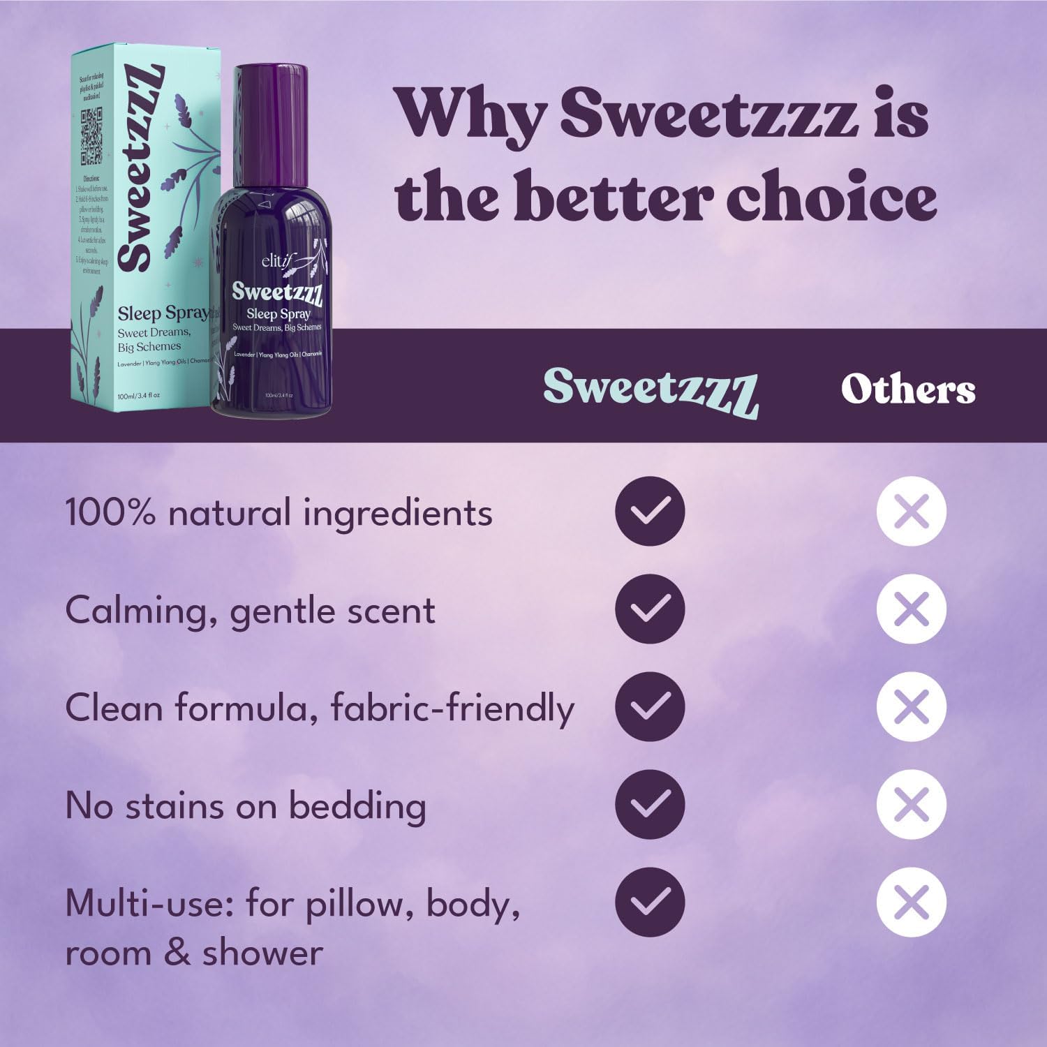 - 🌙 Sleep Sanctuary in a Spray – Infused with lavender, chamomile, and ylang ylang, Sweetzzz transforms your bed into a peaceful retreat, helping you unwind and ease into restful sleep—naturally.