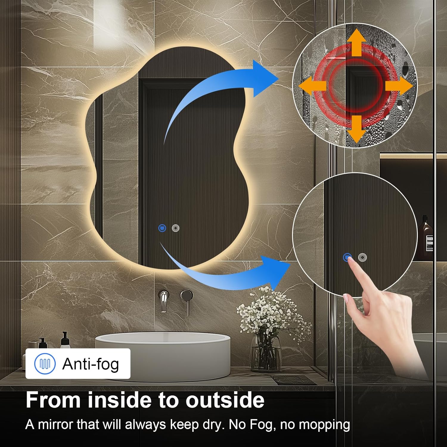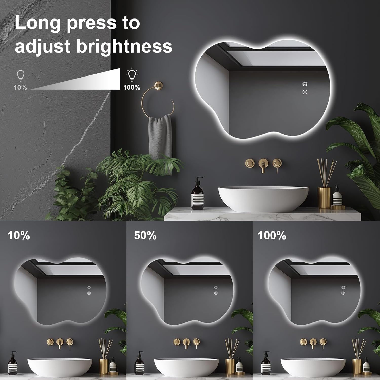 - Eco-Friendly 5MM Asymmetrical LED Bathroom Mirror: Crafted from copper-free, environmentally friendly materials, this mirror features a silvered reflective layer for a sharp, clear image.