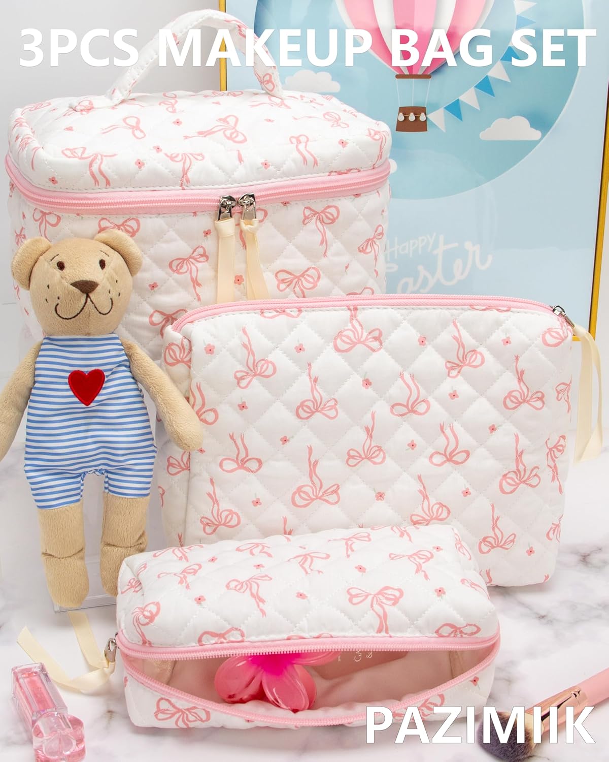 3PCS Makeup Bag SET Large Travel Quilted Zipper Soft Cosmetic Case Pouch for Women Girls Make Up,Bow Pink