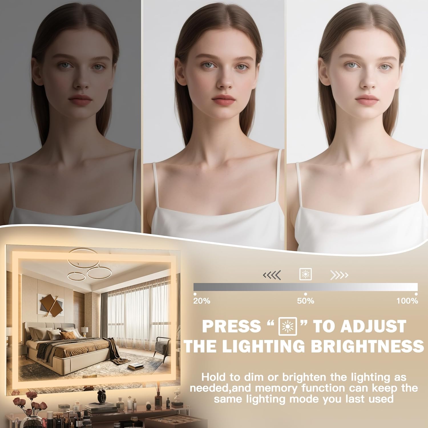 42x32 Inch Lighted Vanity Mirror, 3-Color Lighting & Dimmable Modes, Large LED Makeup Mirror for Bathroom/Dressing Room (Wall/Tabletop Mount, White)