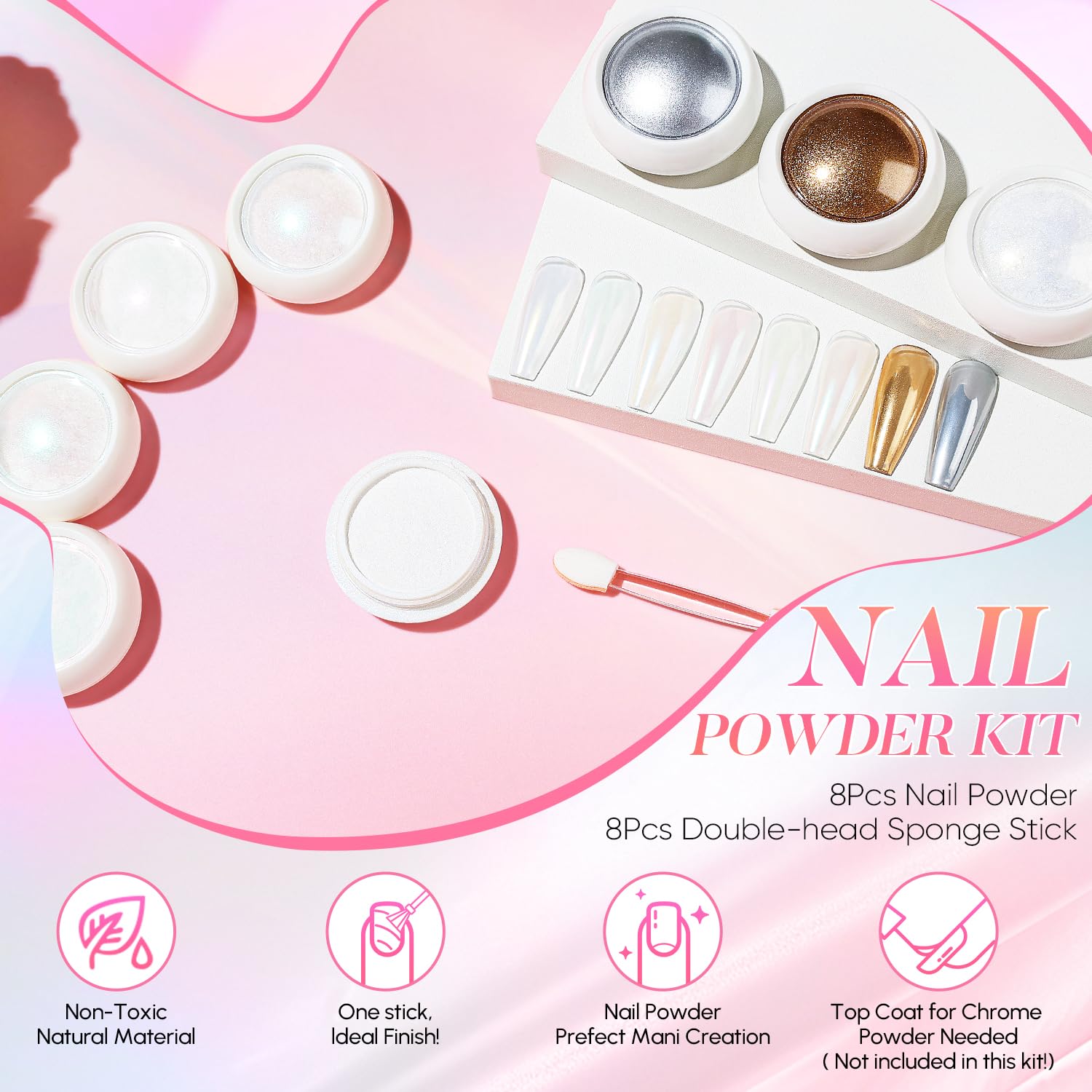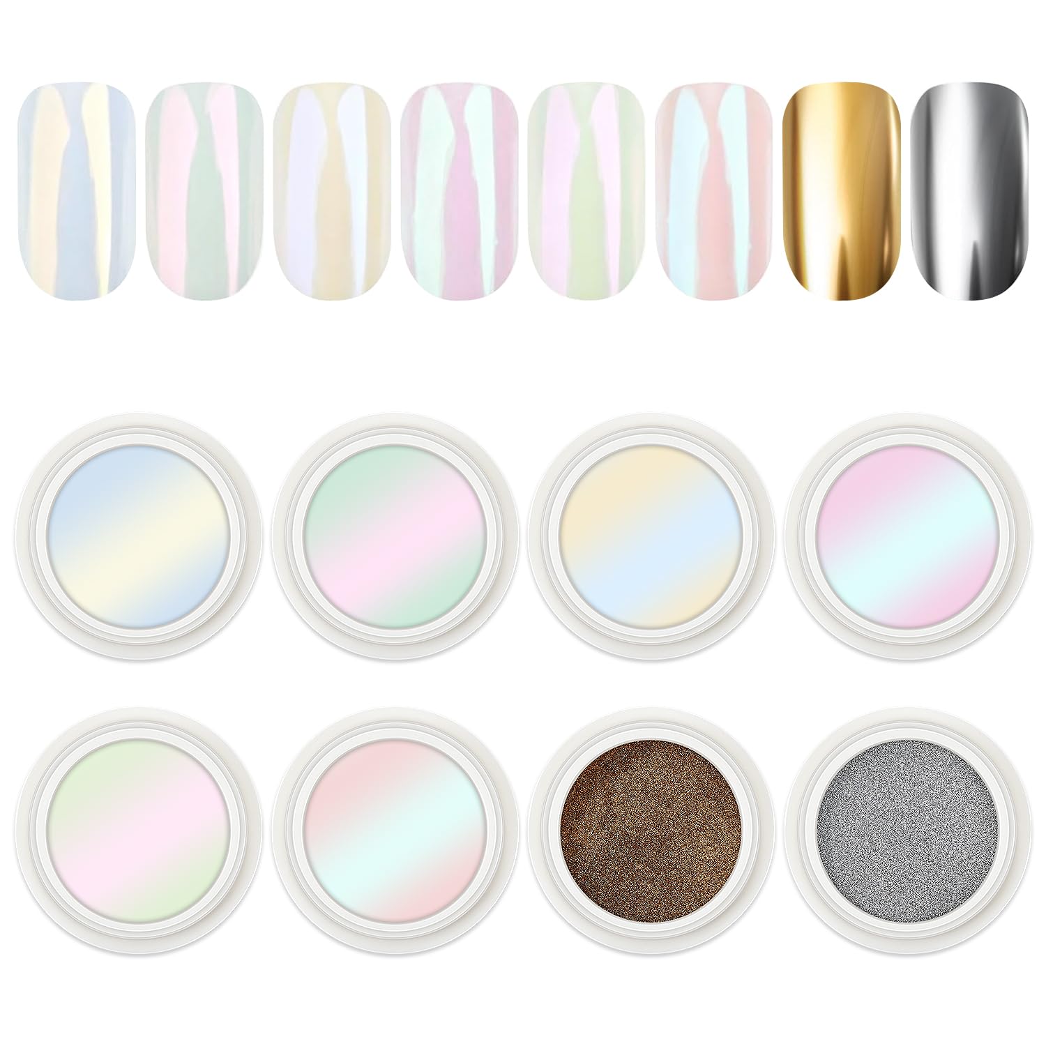 - Package Included: 8 Jars Nail Powder with 8 pcs eyeshadow sticks. You can get pearl iridescent effect when you apply over the light color base gel. And, get aurora chrome effect when you apply over black/dark base gel.