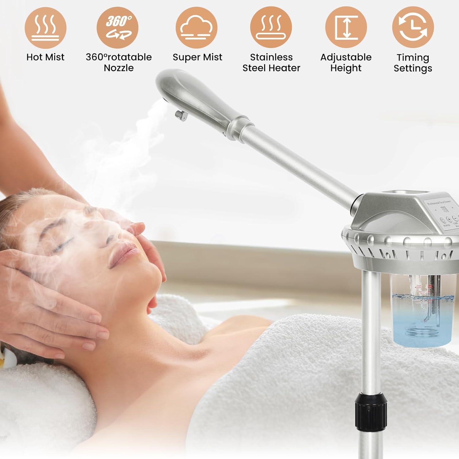 - The nozzle of stand facial steamer can rotate 360° and be freely adjusted between 36-52 inches in height, making it suitable for people of different heights and different scenarios. Whether you are sitting or standing, you can find the most suitable angle to enjoy a professional facial spa treatment at home