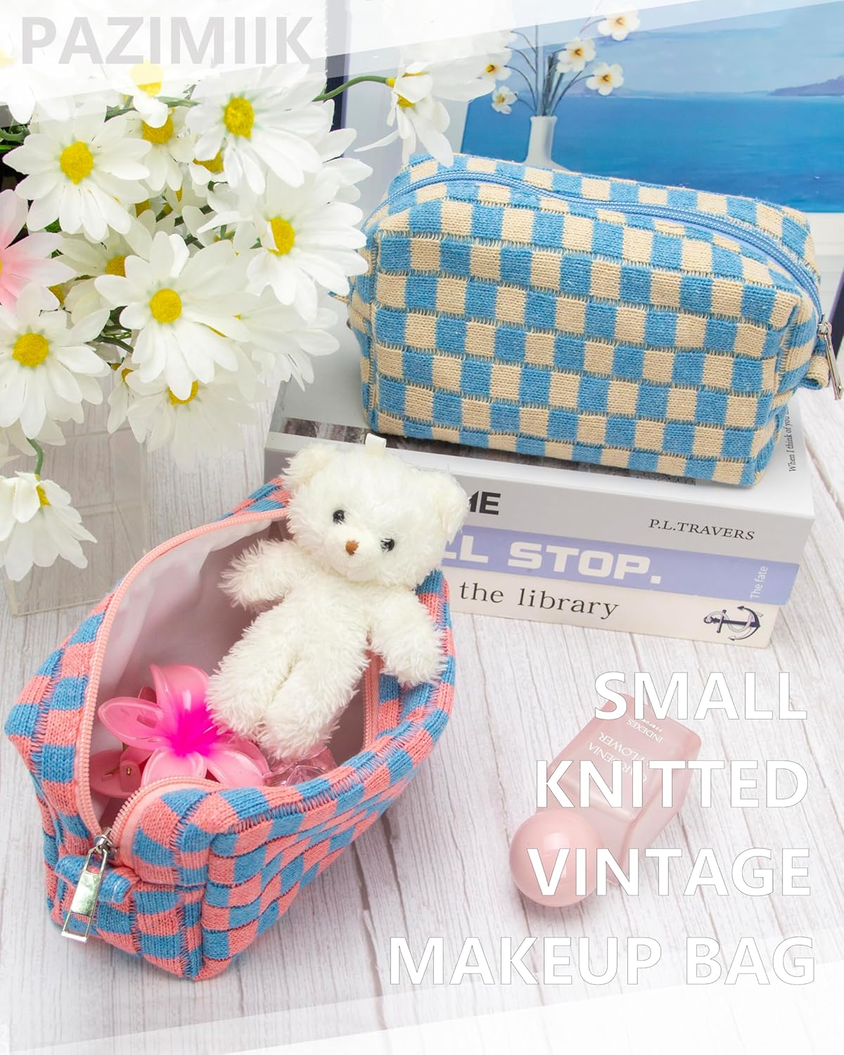 PAZIMIIK Checkered Makeup Bag for Purse Portable Zipper Make Up Pouch Small Cosmetic Case for Travel Red Blue