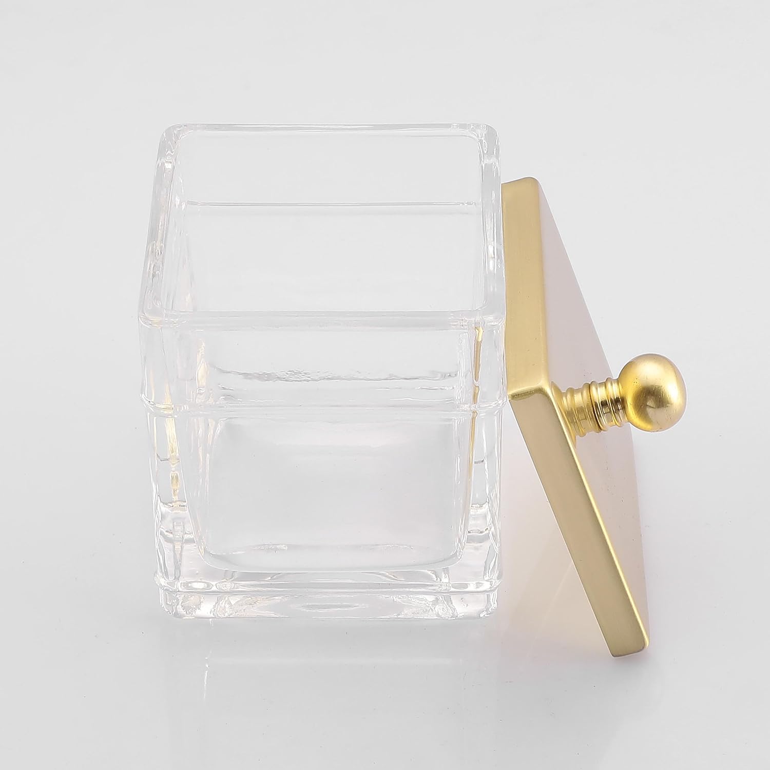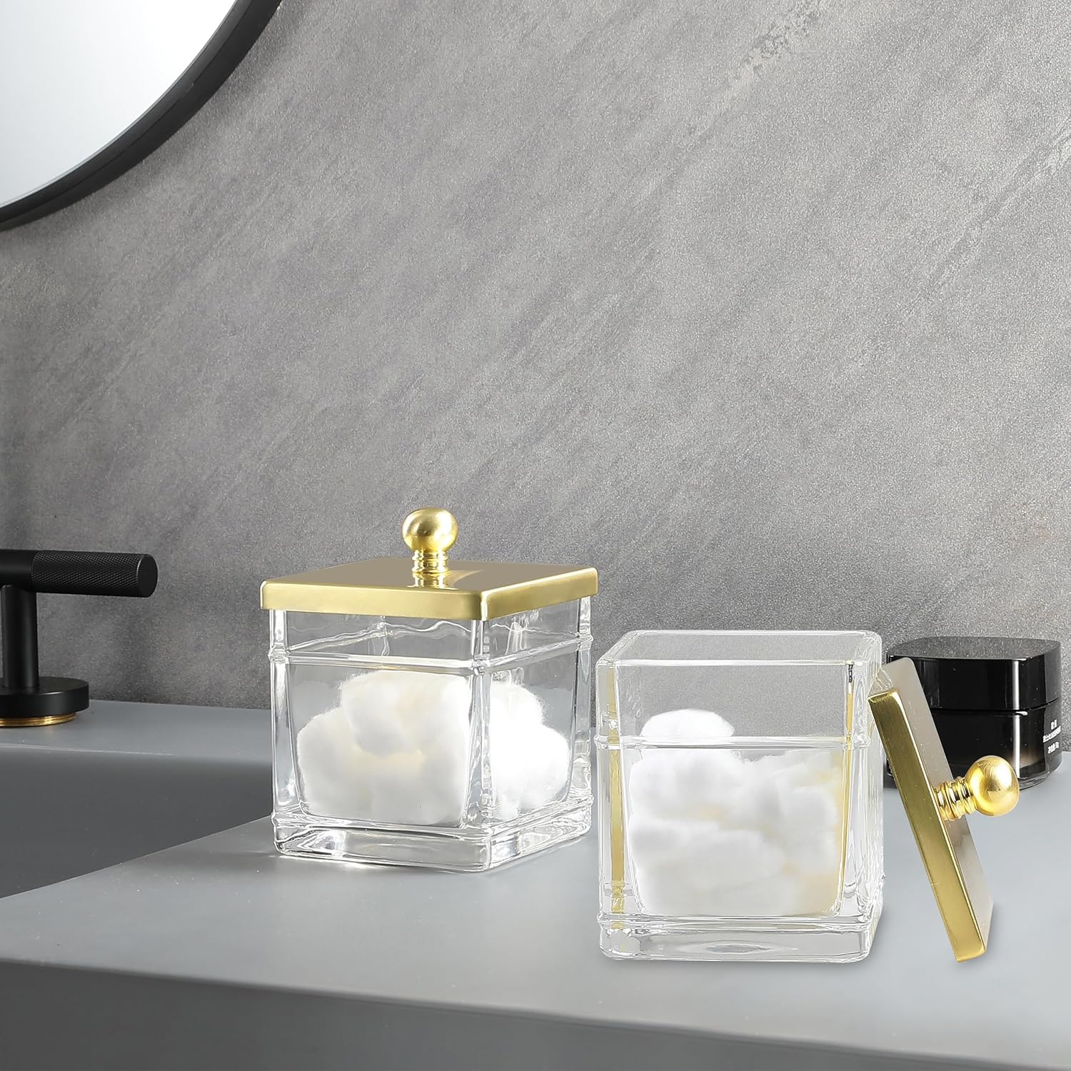 Glass Cotton Jar Holder 2 Pack– Brushed Gold Lid, Elegant Bathroom Storage Canister for Qtips, Cotton Balls, Floss, Makeup Organizer, Vanity & Bathroom Organization